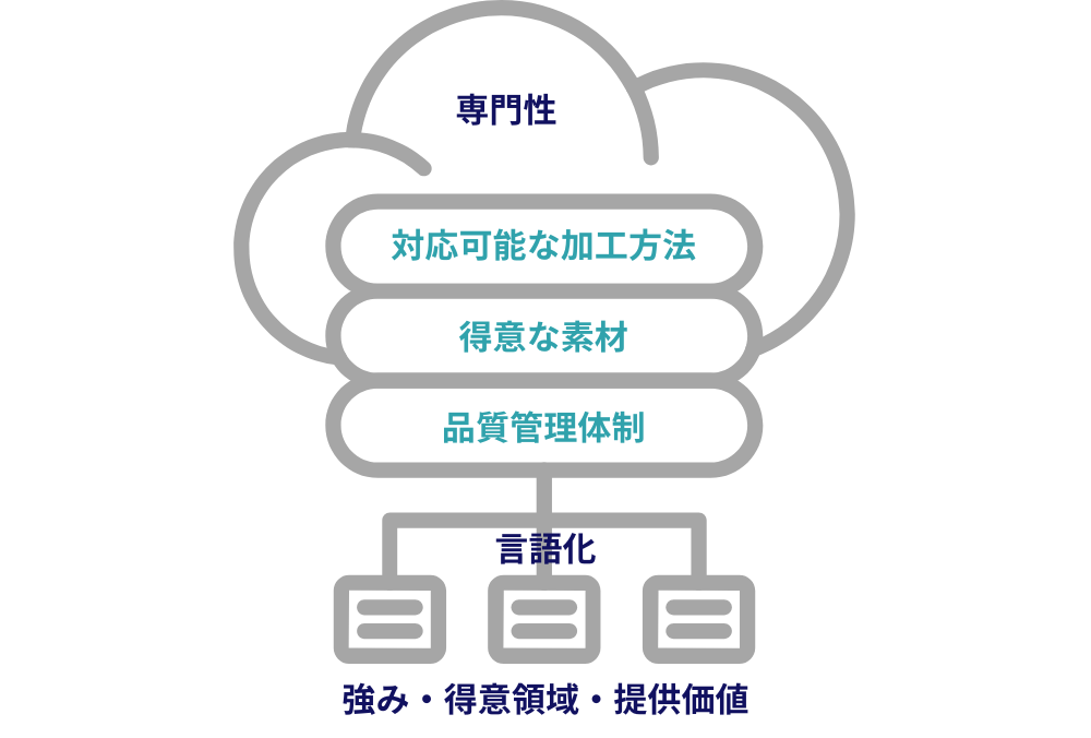 まず、対応可能な加工方法、得意な素材、品質管理体制などを洗い出し、情報を整理しました。