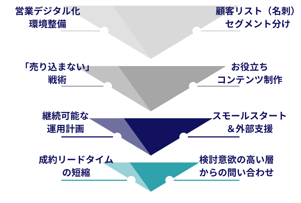 足で稼ぐ営業からデータに基づき「選ばれる営業」へ。まずは貴社の課題をお聞かせください。一緒に未来の商談を作っていきましょう。